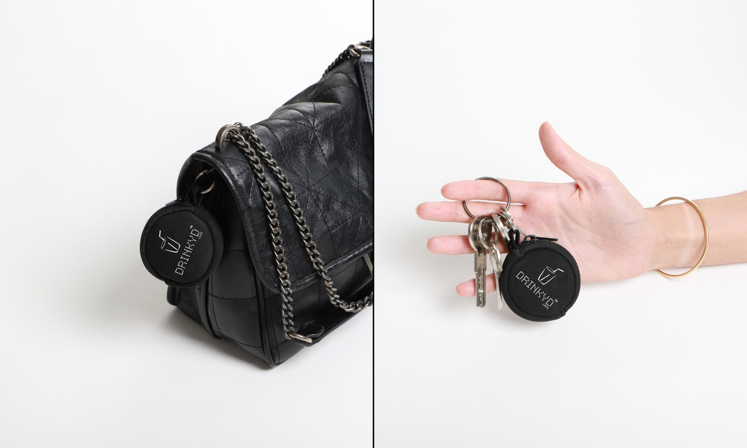 Choose the color of your Drinkyd™ and hang it quickly on your keys or your handbag. Take your Drinkyd™, place it on your glass and drink with peace of mind. More colors coming soon...
